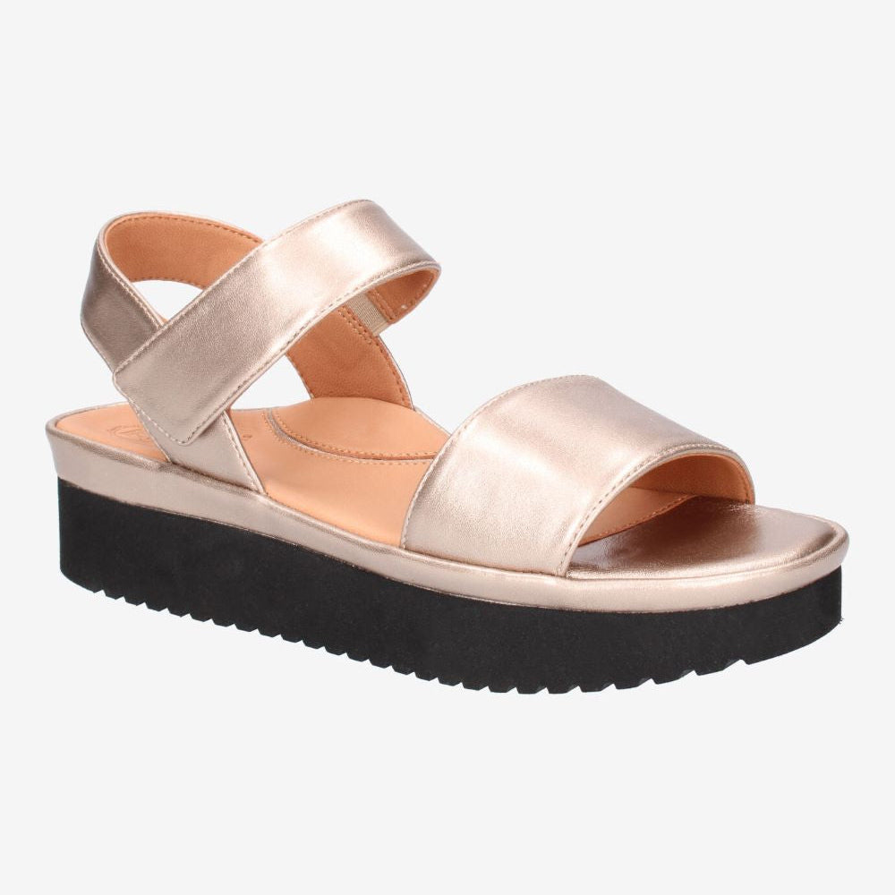 This suede leather sandal has a memory foam insole, leather lining and synthetic outsole. This shoe has a hook and loop closure on a 1.5 inch heel.