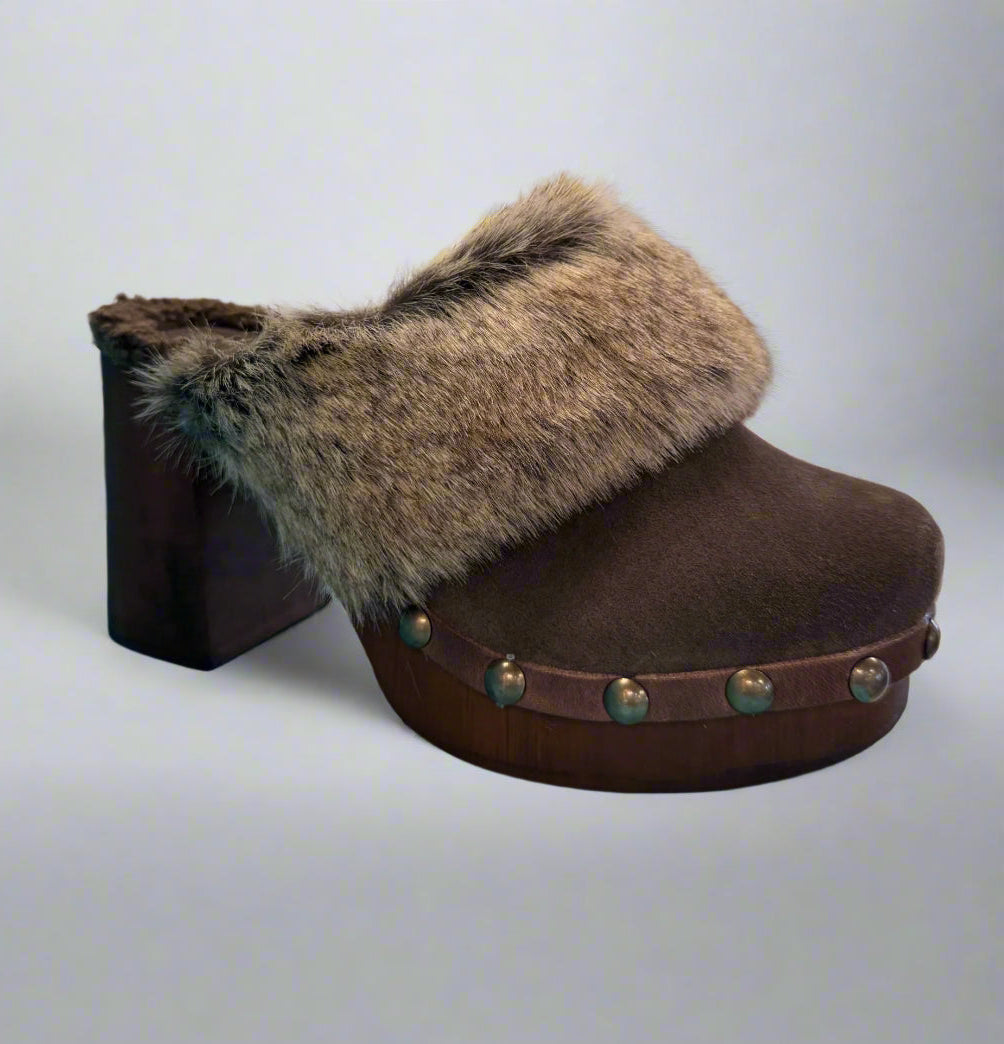 Step into cozy charm with the Chocolat Blu Fadia clog in rich dark brown suede. The faux fur trim adds a soft, playful touch, while the block heel gives just the right lift for all-day fun. Perfect for adding warmth and style to your casual look!