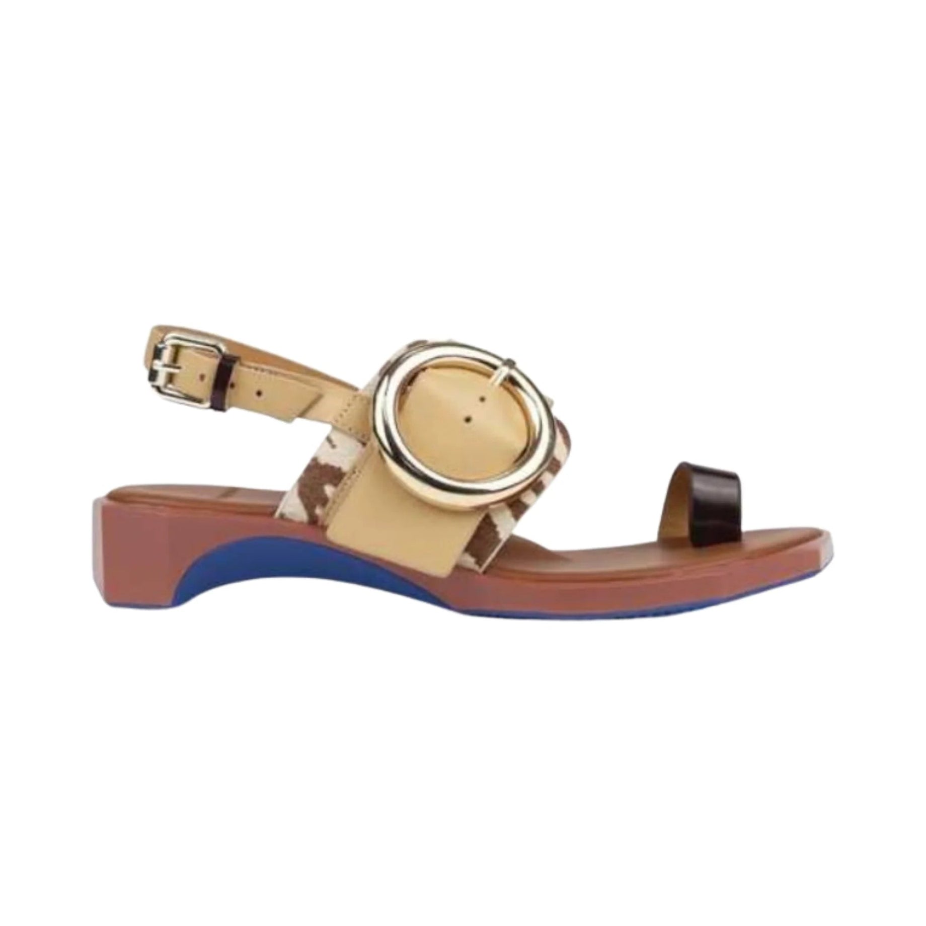 The Follin Torus Sandal in Zebra Mix from 4CCCCEES blends artful design with everyday ease. Crafted with a mix of smooth leather and bold zebra-print detailing, this modern silhouette is defined by its oversized circular buckle—an eye-catching statement that adds sculptural polish. A sleek toe strap and adjustable ankle closure offer a secure, comfortable fit, while the brand’s signature cushioned footbed and subtly contoured sole provide all-day support. Finished with a distinctive color-blocked base, the Follin Torus delivers both comfort and personality in equal measure.
