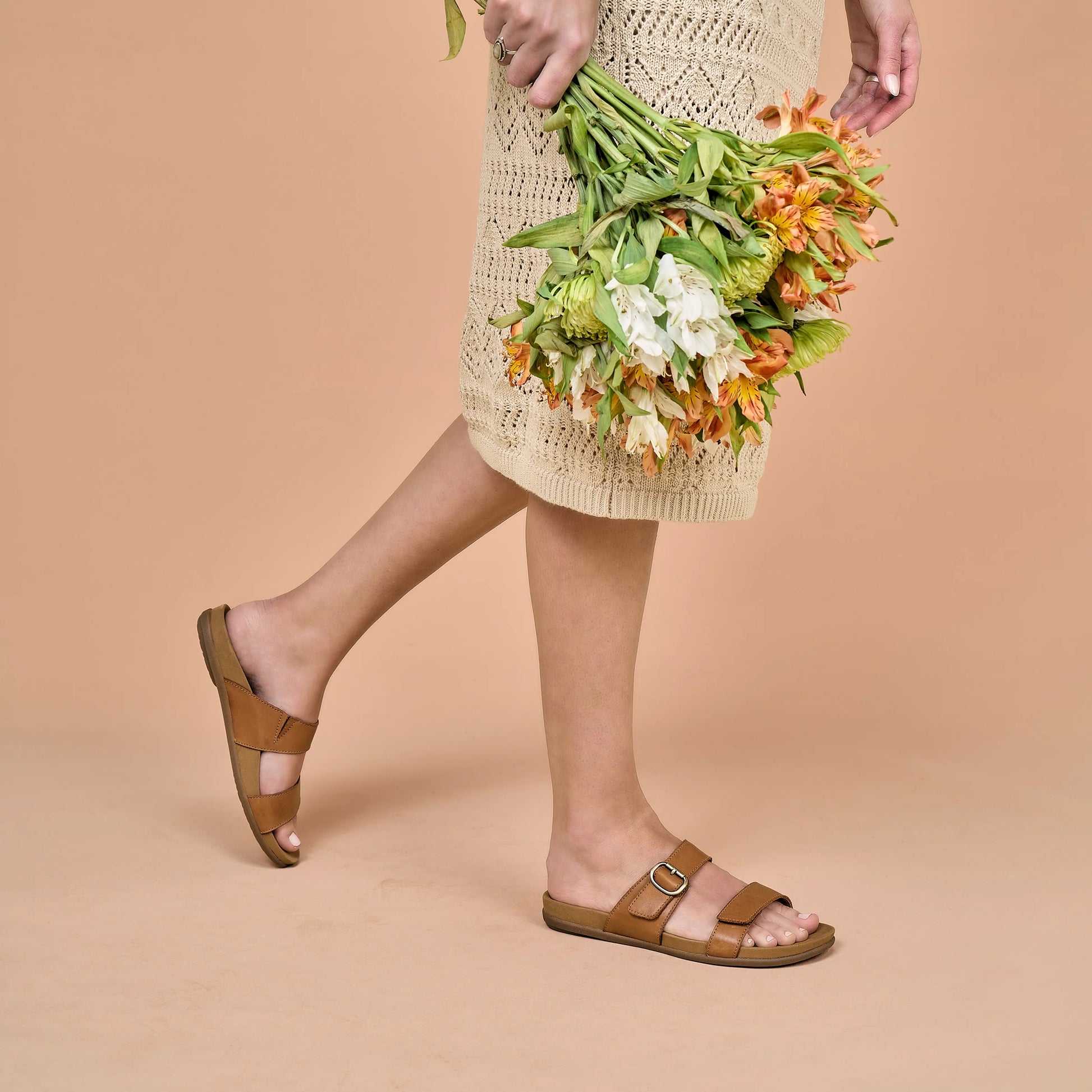 Step into support with Justine, a simple slide sandal made for both summer dresses and casual all-day wear.