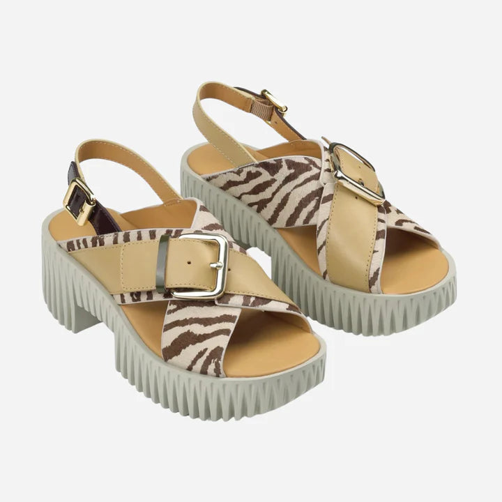 Elevate your shoe collection with the must-have 4CCCCEES Plia Juno Sandals. This iconic design in summer-ready hues will revamp your style for the new season. The chunky, ripple effect flatform sole, paired with a metallic cross-strap and adjustable buckle, make for a bold and comfortable look. Don't miss out on these statement sandals for your spring/summer wardrobe! Ready to upgrade your footwear? Slip on, perfect colour in gold/tan. The comfort of these sandals is amazing.